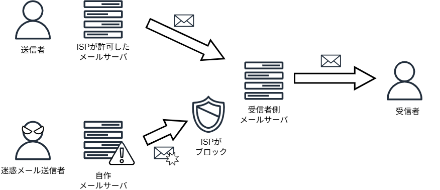 迷惑メールが増加するに伴い、インターネットサービスプロバイダ(ISP)は、OP25B(Outbound Port 25 Blocking)を導入しました。これは、ISPが許可していないメールサーバー(例:自作メールサーバーなど)から外部へのメール送信(ポート25)をブロックすることで、迷惑メールの送信を抑制しています。