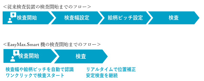 従来は手動で検査幅や絵柄ピッチを設定する必要がありましたが、Easy Start(イージースタートアップ)機能では、検査幅や絵柄ピッチを自動で認識できますので、検査開始前の設定を省く事ができます。